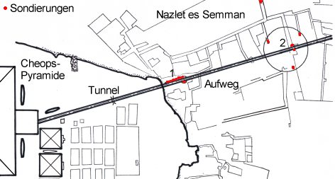 Sondierungen Goyons in Nazlet es-Samman, nach Goyon, La chaussée, Plan auf S. 70. Den Taltempel gefunden zu haben, meinten auch Goyon und Messiha, die drei Surveys in den Sechzigern unternahmen. Goyon meinte nach 658 m das Ende des Aufwegs gefunden zu haben und erkannte dort den Taltempel (2 in der Abbildung oben) [ 4 ]. Allerdings widersprach dem schon allein die Länge des Aufwegs, wie er aus Publikationen des 19. Jahrhunderts noch zweifelsfrei hervorgeht. Auch archäologisches Material zur Stützung seiner These war nicht vorhanden. Seine Sondagen in diesem Bereich, die einen Raum um das von ihm postulierte Ende einnehmen, sind dort, wo sie ein Fundament aufweisen müßten, nur mit "pas de pierres" oder verschlepptenm Material gekennzeichnet. Messiha will sogar einen Knick des Aufwegs nach Süden um 15° ausgemacht haben [ 5 ]. Dort, südlich des Aufwegs und in einer Geraden mit der Cheopspyramide, hatten seine Sondierungen 1965 und 1967 auf einer Fläche von 28 x 24 m ein Kalksteinpflaster in situ ergeben. Material und Ausmaße der Kalksteine entsprechen jenen des Aufwegs. Messihas Fundamentpflaster wurde schließlich als Taltempel anerkannt [ 6 ].