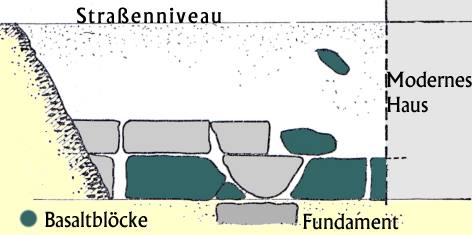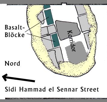 Um den eigentlichen Taltempel jedenfalls kann es sich bei diesen Spuren nicht handeln, denn dieser wurde in großem Abstand davon entdeckt, und zwar bei den Abwasserarbeiten des Sphinx Emergency Sewage Projects im März 1990 [ 13 ]. Bei dieser Entdeckung wurden Reste des Taltempels und des Aufwegs in mehreren Gräben nachgewiesen. Der Taltempel zeichnet sich durch ein schwarz-grünes Basaltpflaster ab, das 14,20-14 m über dem Meeresspiegel bzw. 4,5 unter dem heutigen Bodenniveau liegt. Das Pflaster ist nicht mehr vollständig erhalten und wurde wahrscheinlich schon im Altertum abgebrochen. Einige Lücken könnten jedoch von Zwischenwänden herrühren, die aber ebenfalls schon beraubt oder zerstört wurden [ 14 ]. Dafür spräche die Stratigraphie, denn der angeschwemmte Nilschlamm hat die Basaltblöcke versiegelt. In diesem Nilschlamm gab es keinerlei kulturelle Hinterlassenschaften und kein Indiz dafür, daß man jemals versucht hätte bis zum Pflaster vorzudringen [ 15 ]. Die ältesten Spuren stammen aus römischer Zeit und bestehen in einem Bruchstück einer römischen Amphore. An der Südecke der Basaltblöcke wurden Reste einer Mauer aus Lehmziegeln mit einer wahrscheinlichen Breite von 8 m gefunden [ 16 ]. Lehmziegelmauern konnten daneben in einem südlich davon gelegenen Testgraben bestätigt werden. Es besteht kein Zweifel, daß es sich bei dieser eher zufälligen Entdeckung um den richtigen Taltempel des Cheops handelt. Hawass sieht diese Entdeckung durch eine weitere Mauer im Dorf bestätigt. Einen vollständigen Plan des Tempels gibt es nicht, jedoch konnte mit Sicherheit die Länge des Tempels bestimmt werden [ 17 ]. Fünf zusätzlich Testgräben, die den Befund bestätigen, wurden im Westen gezogen [ 18 ]. Der Aufweg knickt an der Stelle der Grabungen Goyons, in der Abdel Hamid el-Wastani Street, um weitere 32° nach Norden ab und verläuft bis zum eigentlichen Taltempel noch 125 weit. Damit ist der Taltempel 825 m vom Pyramidentempel an der Ostseite der Pyramide entfernt [ 19 ]. Angesichts dieses kläglichen Befundes, der kaum mehr als die Standortbestimmung zuläßt, kann man schwerlich auf die architektonische Gestaltung des Taltempels schließen. Die Herleitung aus der Entwicklung ist kaum einfacher, denn am direkten Vorgänger der Cheopspyramide, der Roten Pyramide, ist der Befund eher noch schlechter zu deuten. Fest steht, daß der Taltempel sicher mit Chephren seine Form gefunden hat. Wahrscheinlich eher aus einer auch sonst nicht unüblichen Ähnlichkeit zwischen der Architektur der Taltempel und der Pyramidentempel schließt Stadelmann auf einen "von Pfeilern umstandenen Hof" [ 20 ].