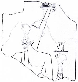 Dieses Reliefbruchstück aus dem Pyramidentempel zeigt den König Eindeutig belegt ist hingegen die Existenz von Reliefs im Tempel. Das zeigen vor allem zwei eindrucksvolle Beispiele, die Hassan 1938 fand, die er aber fälschlicherweise dem Aufweg zuordnete, wohin sie sicher nicht gehören [ 20 ]. Beide Reliefs sind Ausschnitte eines größeren Themenkreises, sodaß die Vermutung vorgebracht wurde, daß sie sich zusammen mit einer größeren Komposition auf den Innenwänden des Hofes befanden, und daß dieser sogar rundherum mit Reliefs bedeckt war [ 21 ]. Das eine Bruchstück zeigt Cheops beim sog. "Fest des Weißen Nilpferds" [ 22 ]. Reste solcher Darstellungen, die eine alte Nilpferdgöttin im Umfeld des unterägyptischen Königtums zum Inhalt haben, wurden im Alten Reich u.a. im Sonnenheiligtum des Königs Neussere aufgefunden.