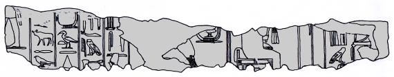 Reliefbruchstück aus Pyramidentempel mit dem Namen des Cheops.Nach Lauer, Notes complémentaire, Pl. IIa. Das zweite Bruchstück zeigt einen schmalen Ausschnitt des Sed-Festes, das zum üblichen Programm vor allem auch der Pyramidentempel gehört [ 23 ]. In einer Kolumne ist der Name der Cheopspyramide zu finden, in einer anderen thront er im Heb-Sedmantel [ 24 ]. Der Name des Cheops ist in einer anderen Kartusche noch am untersten Ende zu erkennen. Aus dem Zusammenhang gerissen lesbar ist noch sm3-wr, der "große Stier" und sh.f jm stj.., "Zelt...". Damit sind wir zurück bei der Frage nach der Bedeutung der Reliefs aus der Pyramide Amenemhets I., die uns schon im Zusammenhang mit dem Aufweg beschäftigt hatte. Dafür kämen insgesamt sechs Bruchstücke mit zum Teil sehr interessanten Szenen, die den Namen des Cheops direkt tragen, ursprünglich aus dem Pyramidenkomplex des Cheops [ 25 ]. Wie bereits dort besprochen, ist das nicht sicher nachweisbar, aber falls doch, ist die Wahrscheinlichkeit, daß einige davon aus dem Pyramidentempel stammen, durchaus gegeben.