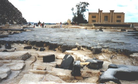 Blick von Süden über das Basaltpflaster des Pyramidentempels. Der Hof des Tempels war einst vollständig mit Basalt ausgelegt, von dem heute etwa nur noch rund ein Viertel in situ liegt. Petrie ist sich sicher, daß das ganze Basaltpflaster auf einem Unterpflaster aus Kalkstein ruht [ 1 ]. Maragioglio & Rinaldi haben diese Beobachtung bestätigt und bemerken, daß unter dickeren Basaltblöcken dünnere Kalksteinblöcke liegen - und umgekehrt [ 2 ]. Die Basaltblöcke sind in loser Form gearbeitet, aber gleichzeitig perfekt verlegt. Sie wurden mit Sägen und Hämmern bearbeitet. Unebenheiten an der Unterseite der Basaltblöcke wurden nicht dort, sondern am wesentlich einfacher zu bearbeitenden Kalkstein des Unterpflasters angepaßt. Das entspricht der üblichen Methode Hartgestein nur dort zu bearbeiten, wo es unumgänglich ist [ 3 ]. Das Niveau des Felsens wurde vor der Verlegung der Pflaster auf das Niveau des Fundamentpflasters der Pyramide abgearbeitet [ 4 ]. Das Basaltpflaster wurden an allen Seiten hin von einer Pfeilerreihe, nach Westen hin von drei Pfeilerreihen eingerahmt. Die Pfleiler messen 2 x 2 Ellen, also 1,05 x 1,05 m, und bestehen durchgehend aus einem Block [ 5 ]. Eine Ausnahme bilden lediglich die Eckpfeiler, die längsrechteckig und noch massiver gefertigt wurden - sicherlich wegen der aufzunehmenden Last der Architrave. Ingsgesamt wurden 38 solcher Pfeiler aufgestellt [ 6 ]. Die Pfeiler bestanden durchgehend aus Rosengranit [ 7 ], wobei sich Reste davon noch an zwei Stellen in situ befinden. Die Basis der Pfeiler ist noch in allen 38 Fällen durch eine in den Felsen gearbeitete quadratische Fassung sichtbar.