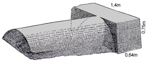 Geböschter Maueraufsatz aus dem Pyramidentempel. Nahe der nordwestlichen Ecke fand Lauer im Schutt des Tempels einen bemerkenswerten Kalkstein, der auf der einen Seite den üblichen, abgerundeten Abschluß geböschter Wände und auf der anderen Seite einen rechteckigen Abschluß aufweist [ 9 ]. Nach Lauers Ansicht befand sich dieser Stein mit dem geböschten Teil als Abschluß auf der Umfassungsmauer. Das andere Ende hätte in der Nordwand des Tempels geendet. Dieser Ansicht haben Maragioglio & Rinaldi widersprochen; sie sehen in dem Block kein Stück der Umfassungsmauer, sondern der Brüstung des Tempeldaches [ 10 ]. Stadelmann hält es für möglich, daß - wie bei Chephren - die Mauern des Tempels bereits eine Hohkehle aufwiesen [ 11 ]. Ebenso gut ist es möglich, daß der Bau den "strengen Stil" aufweist, der in der 4. Dynastie klare Formen mit erhöhter Monumentalität bevorzugt hatte [ 12 ]. Die Außenwände des Tempels bestanden aus Kalkstein. An der Nord-, Süd- und Ostmauer läßt sich noch heute eine Breite an der Basis von 3,14 m ermitteln [ 13 ]. Von der nördliche Mauer sind noch Reste des Fundaments erhalten, während die Südseite nur noch durch leichte Einschnitte verfolgt werden kann, die einstmals das Fundament aufgenommen haben. Die Kalksteinblöcke dieses Mauerwerks waren nur grob zusammengesetzt und wurden dort, wo sie sich nicht berührten, mit kleinen Steinen oder Mörtel aufgefüllt [ 14 ]. Die Stelle, an welcher der Aufweg in die Ostwand mündet, ist noch heute durch eine Schwelle aus Basalt markiert. Maragioglio & Rinaldi nehmen granitene Türpfosten, einen ebensolchen Architrav und eine Tür mit zwei Flügeln an, die sich in den Hof des Tempels geöffnet hat - Spuren davon sind allerdings keine mehr ersichtlich [ 15 ]. Petrie fand einige bearbeitete Bruchstücke aus Granit im Bereich des Tempels, die sehr wahrscheinlich von den Pfeilern stammen. Die Möglichkeit, daß sie aber wenigstens teilweise einem Dado aus Granit angehörten, besteht indes [ 16 ]. Auf dem Basaltpflaster sind keinerlei Sockelspuren nachweisbar, die auf Statuen oder Osirispfeiler des Königs schließen lassen könnten [ 17 ]. Bruchstücke solcher Statuen, aus denen sich z.B. ähnlich Chephren ein Falke im Nacken des Königs befindet, wurden allerdings in der Nähe des Tempels gefunden [ 18 ]. Obwohl die Zuordnung praktisch nicht sicher möglich ist, muß mit Statuen im Pyramidentempel in jedem Fall gerechnet werden. Dafür sprechen auch die vier Priestertitel, die Junker bei seinen Grabungen fand, und die Statuen des Cheops zum Gegenstand haben [ 19 ].