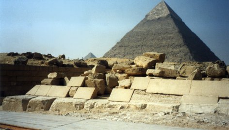 Blick von Osten auf die untersten Lagen der Nebenpyramide. Im Hintergrund die Pyramide des Chephren.