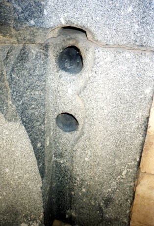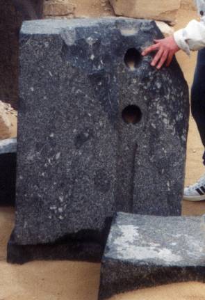 Bohrungen in einem Türrahmen aus Basalt im Pyramidentempel des Königs Sahure in Abusir. |