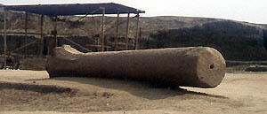 Granitsäule in Tanis aus Rosengranit mit Bohrung an der Unterseite zur Einzapfung in die Säulenbasis, die vermutlich aus einem Pyramidenbezirk des Alten Reiches stammt. |