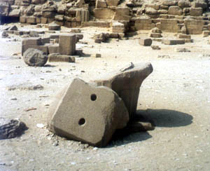 Bohrungen in einem Abakus aus Rosengranit im Pyramidentempel des Königs Unas in Sakkara. |