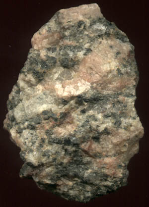 Struktur des Rosengranits in Vergrößerung. Die rote Farbe ist die Folge einer Oxidation der Eisenspuren im alkalischen Feldspat. |