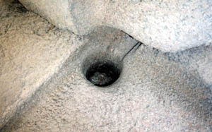 Bohrung in Rosengranit für eine Türangel im Pyramidenkomplex der Königinnen von Pepi II. in Sakkara-Süd. |